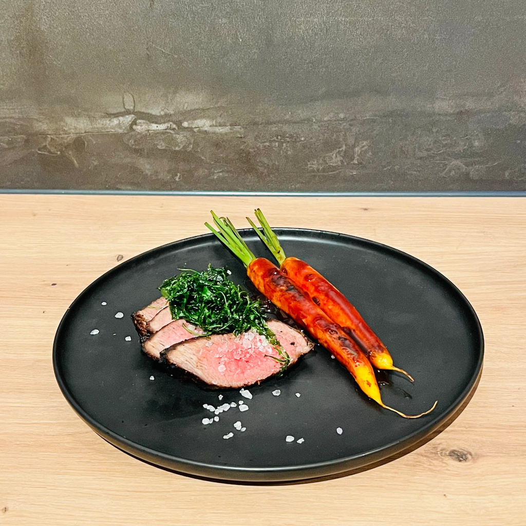 Saftige Tafelspitzstücke über offener Glut gegrillt, begleitet von bunt karamellisierten Karotten in fruchtigem Heidelbeer-Balsamico-Sud. Brasilianisches Feuer trifft auf bayerische Raffinesse! 🔥🥕