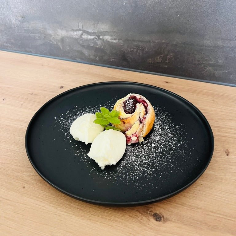 Zarte Blätterteigrollen mit Mascarpone-Fruchtfüllung, im gebutterten Randl im Big Green Egg ausgebacken. Dazu hausgemachtes Vanilleeis – der perfekte Abschluss für dein BBQ-Abenteuer! 🍨🔥
